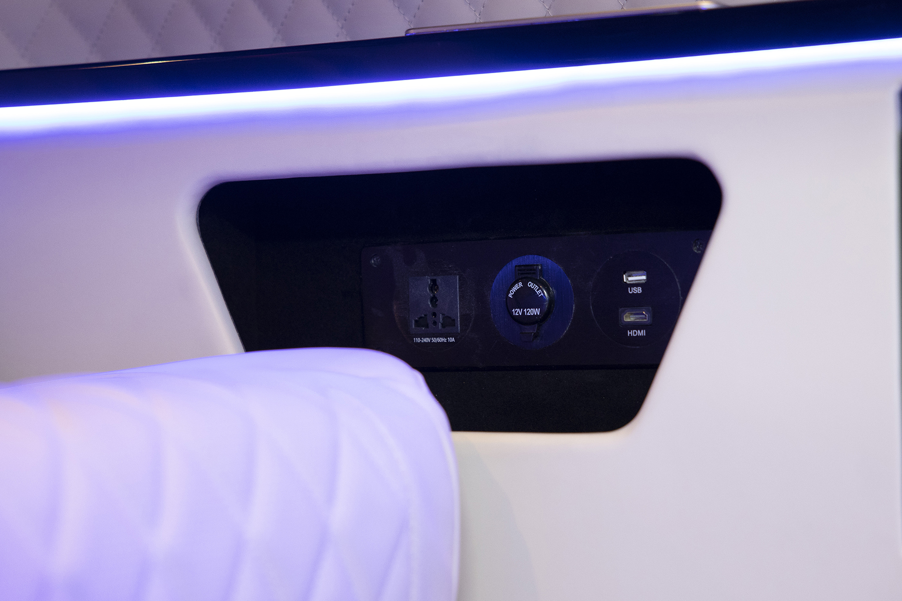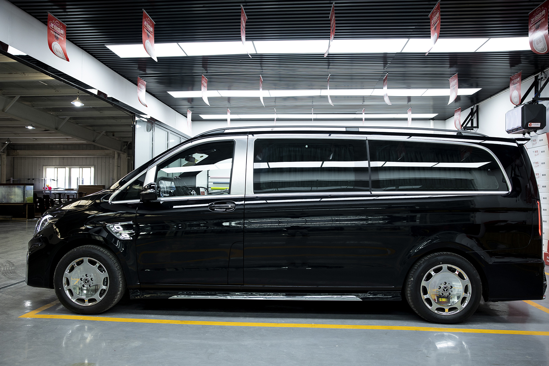 内饰:双连屏仪表台、定制商务舱隔断、升降电视(高清)、定制酒柜、天幕繁星顶等。