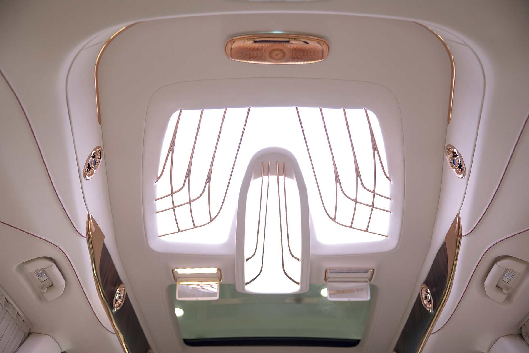 内饰:整车进口木饰装饰、玫瑰金镀铬工艺、JYJX航空商务舱座椅、定制环抱侧壁等。